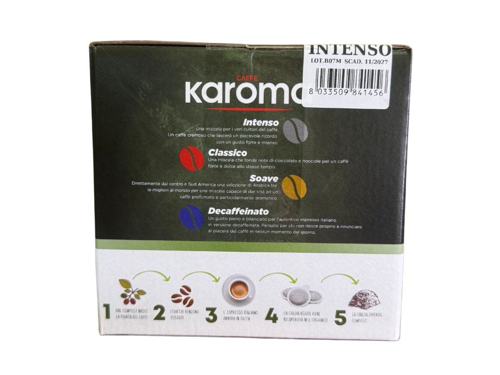 Pody (Intenso) představují silnou směs určenou speciálně pro E.S.E. pody. Díky vysokému podílu robusty nabízí intenzivní chuť, plnější tělo a hustou cremu. Jsou ideální pro ty, kteří preferují výrazné espresso s bez kyselosti, připravené pohodlně a bez nepořádku.