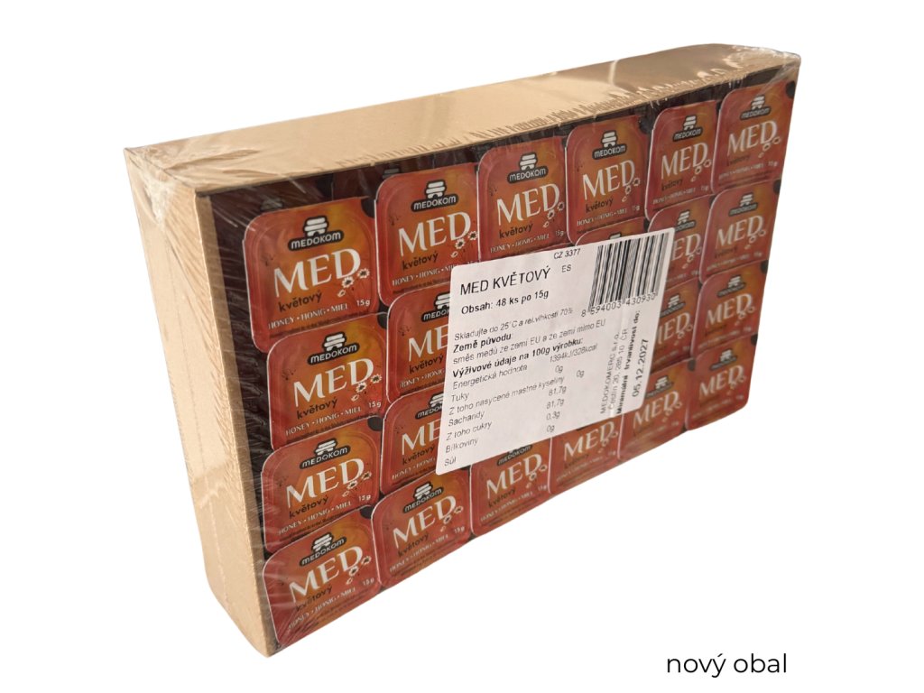 Medokomerc přírodní med květový, hygienicky balený a jednotlivě porcovaný po 15g. Ideální ke slazení čaje, kávy a dalších nápojů.