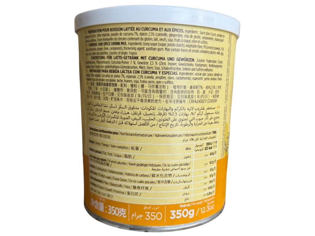 Složení: moučkový cukr (cukr, bramborový škrob), rostlinná vláknina, kurkuma (7 %), koření (2,5 %) – skořice, zázvor, hřebíček, kardamom, zahušťovadlo: xanthanová guma
