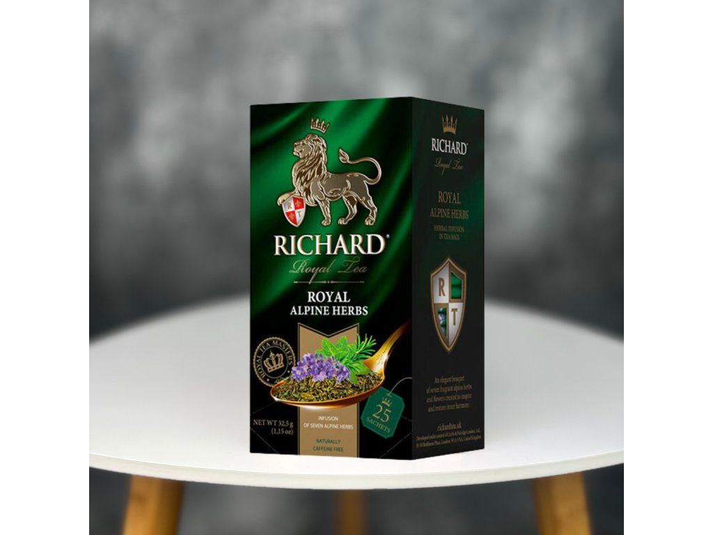 Prémiový bylinný čaj s příchutí alpských bylinek od značky RICHARD. Porcovaný čaj v nálevových sáčcích, jednotlivě balený do obálek pro uchování vůně a chuti.