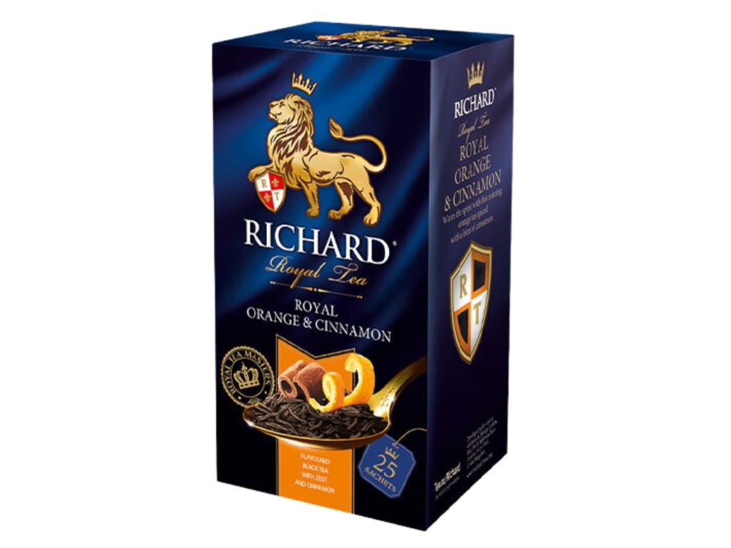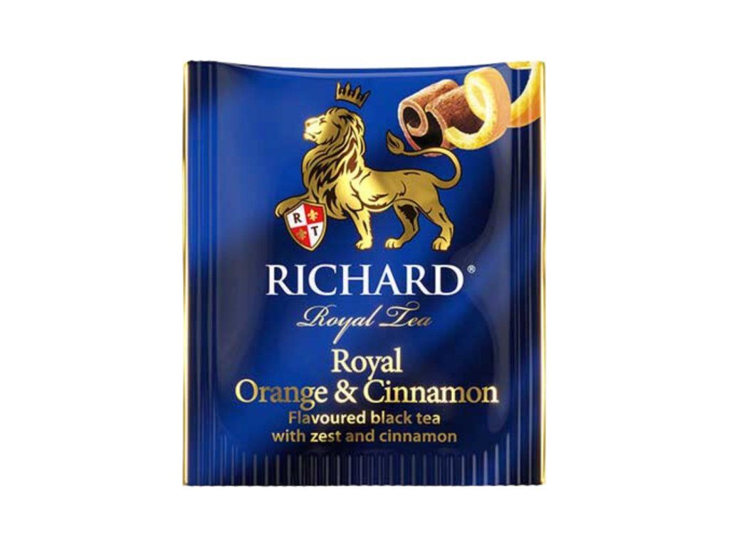 Prémiový černý čaj s příchutí pomeranče a skořice od značky RICHARD. Porcovaný čaj v nálevových sáčcích, jednotlivě balený do obálek pro uchování vůně a chuti.
