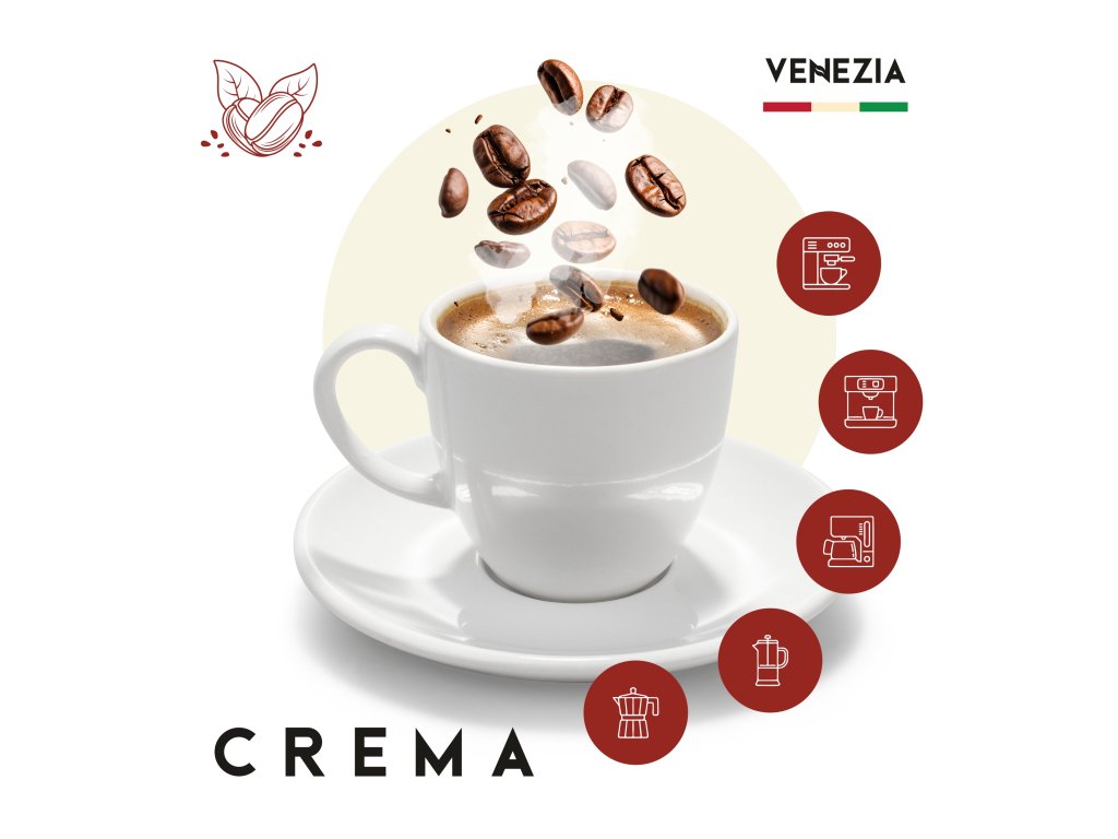 Směs Venezia Crema byla vytvořena, aby přinesla to nejlepší z italského stylu pražení. Je to dokonale vyvážená směs zrn Arabica s nejlepšími odrůdami Robusta. Díky poměru 50/50 chuť odhaluje příjemnou vůni čokolády, oříšků a jemný karamelový tón. Káva Venezia Crema nemá prakticky žádnou kyselost, takže je vhodná pro většinu milovníků kávy. Ideální pro černou kávu, americana, intenzivní espressa a cappuccina!